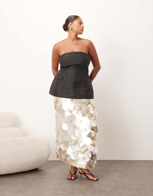 ARRANGE Curve – Srebrna kolumnowa spódnica maxi z lustrzanymi cekinami