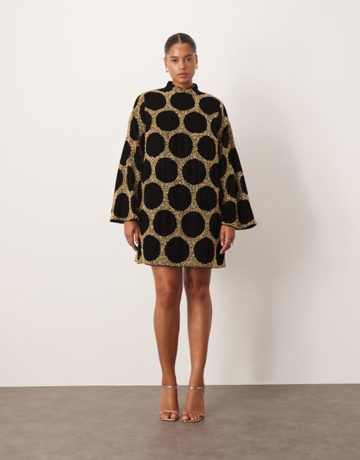 ARRANGE Curve – Złota zdobiona sukienka mini w kropki z półgolfem i długimi rękawami