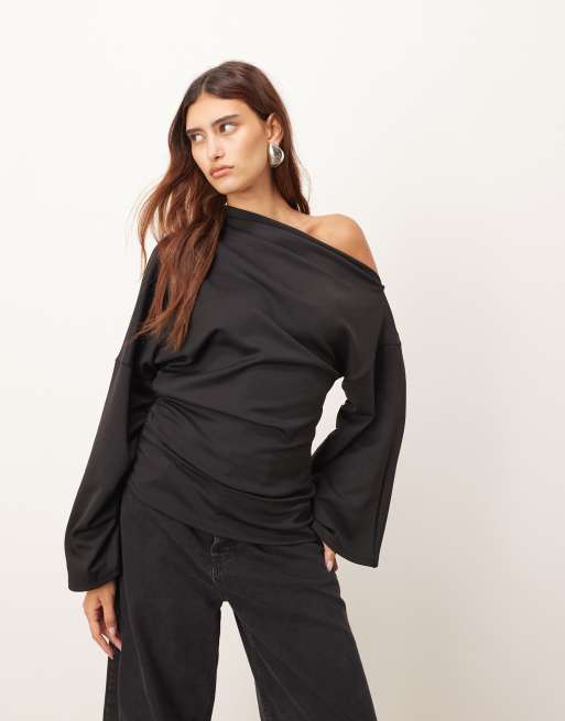 ARRANGE – Czarny, dżersejowy top z odsłoniętym ramieniem, szerokimi rękawami i marszczonym dołem