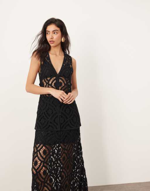 ARRANGE – Czarny zapinany na guziki szydełkowany długi top, część zestawu