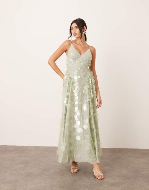 ARRANGE – Jasnozielona zdobiona cekinami sukienka midi na ramiączkach z pełną spódnicą