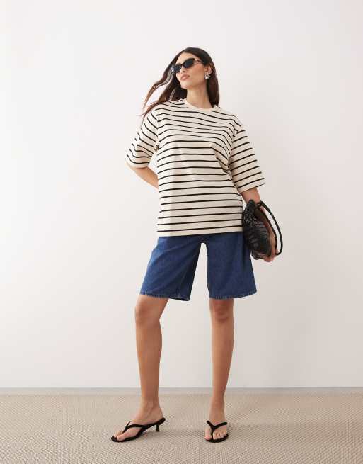 ARRANGE – Kremowy gruby T-shirt premium oversize w paski