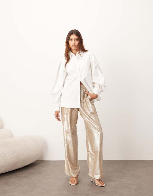ASOS DESIGN – Kremowe eleganckie cekinowe spodnie z prostymi nogawkami