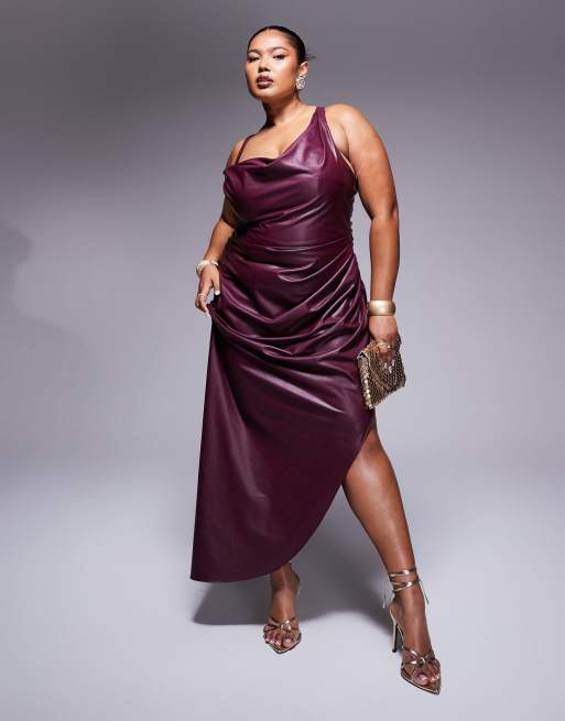 ASOS DESIGN Curve – Burgundowa poliuretanowa sukienka kopertowa midi na jedno ramię z paseczkami i drapowaniem