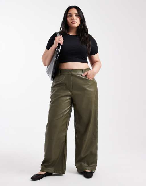 ASOS DESIGN Curve – Ciemnozielone spodnie o męskim kroju z niskim stanem z imitacji skóry