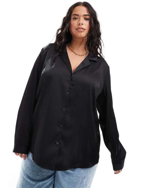 ASOS DESIGN Curve – Czarna luźna satynowa koszula z długim rękawem