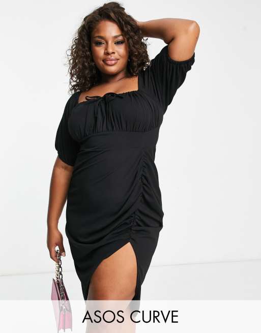 ASOS DESIGN Curve – Czarna ołówkowa sukienka midi typu milkmaid z marszczonym dekoltem