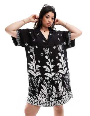 ASOS DESIGN Curve – Czarna sukienka koszulowa w stylu bowling w biały wzór w chusty