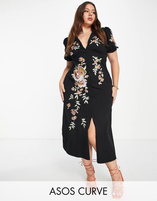 ASOS DESIGN Curve – Czarna sukienka midi z kołnierzykiem w haftowany kwiatowy wzór