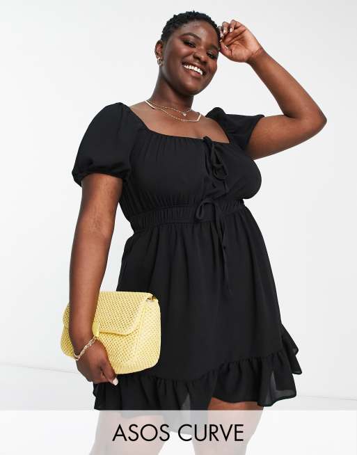 ASOS DESIGN Curve – Czarna wiązana z przodu sukienka mini z krótkimi rękawami