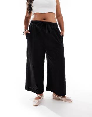 ASOS DESIGN Curve – Czarne spodnie z szerokimi nogawkami, paskiem i haftem angielskim