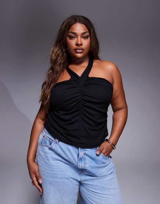 ASOS DESIGN Curve – Czarny krótki marszczony top o przylegającym kroju z dekoltem typu halter