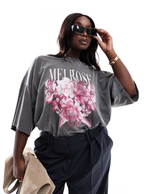 ASOS DESIGN Curve – Czarny T-shirt oversize z efektem sprania i grafiką z napisem „Melrose”
