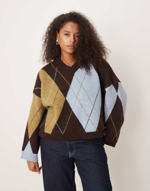 ASOS DESIGN Curve – Czekoladowy sweter w romby o pudełkowym kroju z dekoltem w kształcie litery V