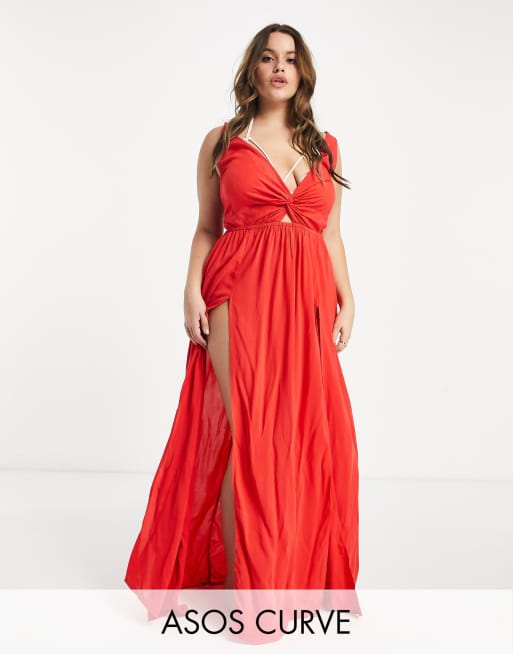 ASOS DESIGN Curve – Czerwona sukienka plażowa maxi z wiązanym tyłem i skręconym przodem