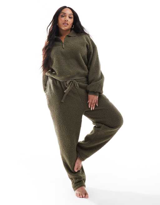 ASOS DESIGN Curve – Dresowy zestaw z kożuszka w kolorze khaki: bluza z kołnierzem i zapięciem na suwak pod szyją i zwężane spodnie