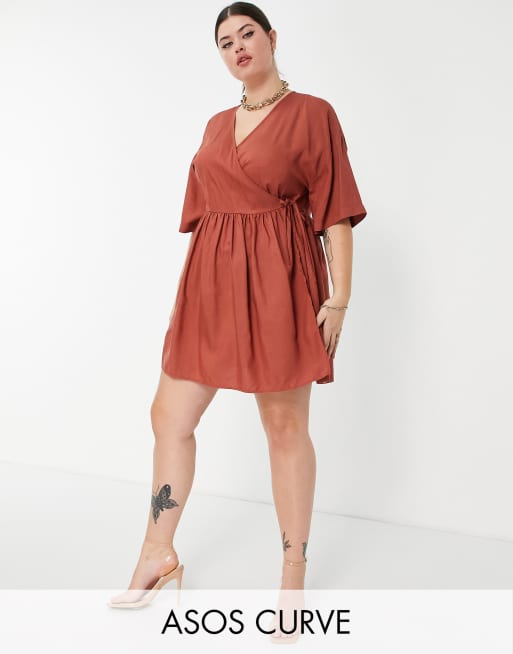 ASOS DESIGN Curve – Edit – Rdzawa luźna sukienka mini z kopertowym przodem i kimonowymi rękawami