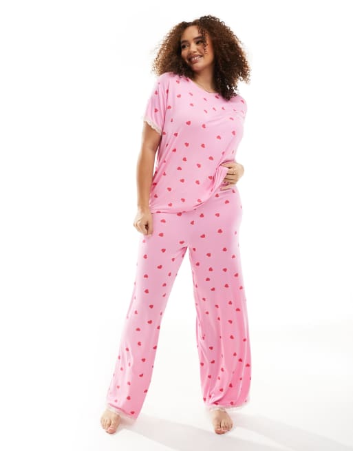 ASOS DESIGN Curve Exclusive – Przytulna różowa piżama w serca z T-shirtem i spodniami