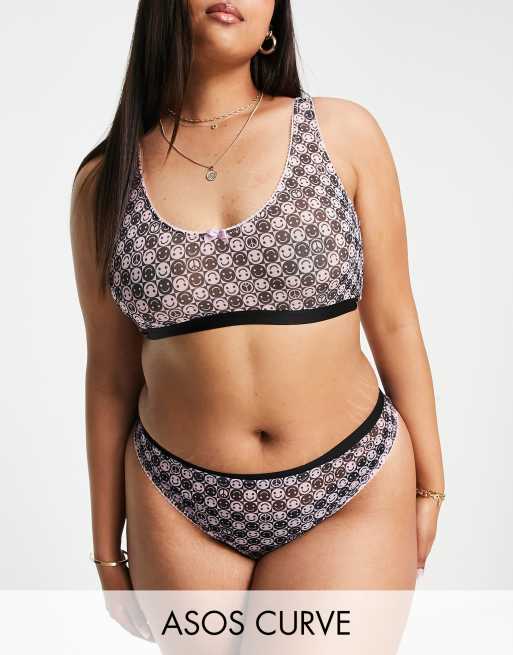 ASOS DESIGN Curve Exclusive – Różowo-czarne siateczkowe stringi we wzór w uśmiechnięte buźki