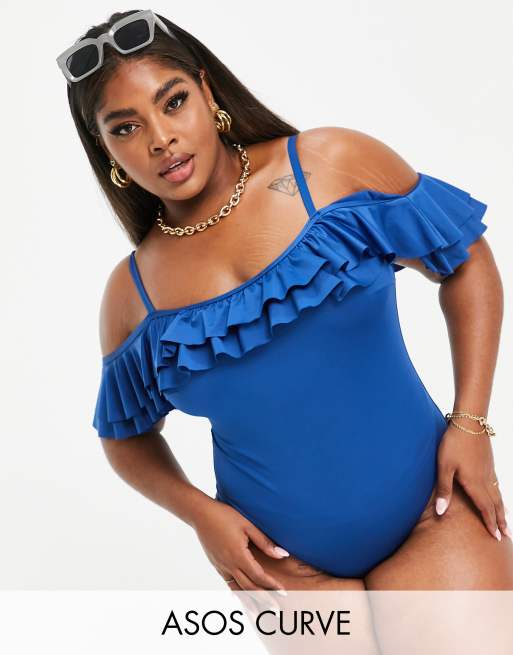 ASOS DESIGN Curve – Granatowy strój kąpielowy z warstwową falbanką i odsłoniętymi ramionami