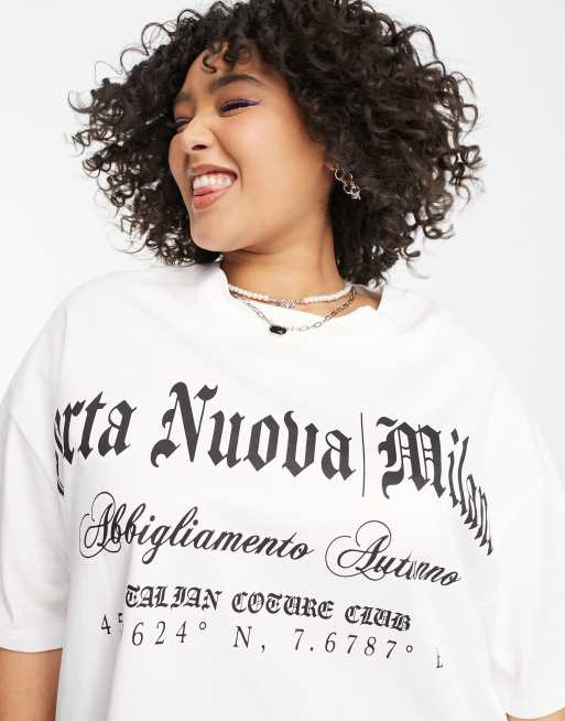 ASOS DESIGN Curve – Gruby biały T-shirt o fasonie super oversize z gotycką grafiką „Milano"