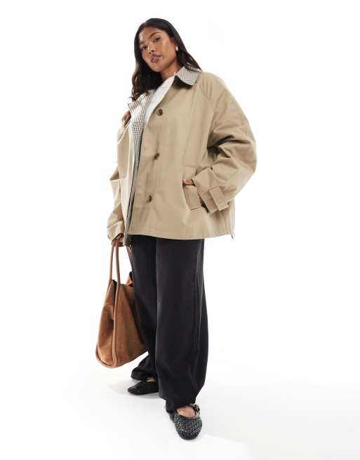 ASOS DESIGN Curve – Jasnobeżowy trencz z podszewką w kratkę