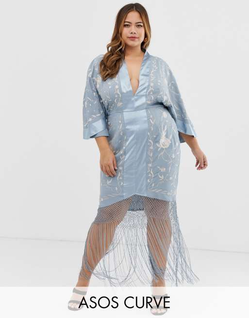 ASOS DESIGN Curve – Kimonowa haftowana sukienka o długości midi wykończona frędzlami