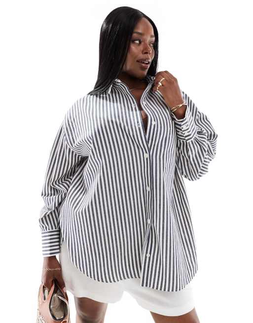 ASOS DESIGN Curve – Koszula oxford z imitacji lnu w granatowe paski