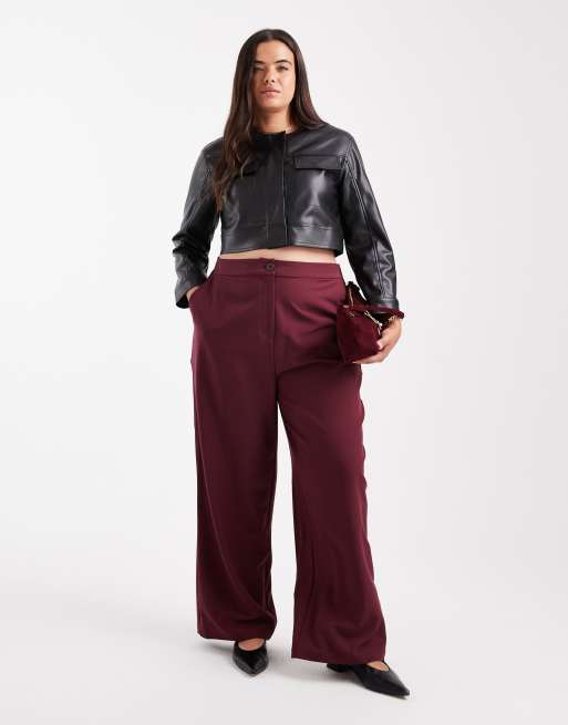 ASOS DESIGN Curve – Luźne eleganckie spodnie z prostymi nogawkami w ciemnym wiśniowym kolorze