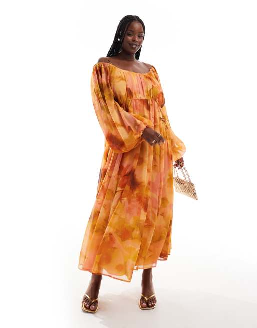 ASOS DESIGN Curve – Marszczona w talii sukienka maxi z dekoltem w kształcie litery U w pomarańczowy kwiatowy wzór