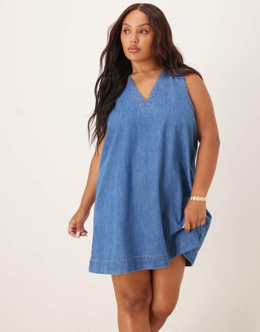 ASOS DESIGN Curve – Niebieska jeansowa sukienka o prostym kroju z dekoltem V