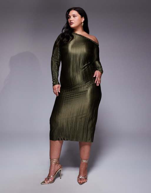 ASOS DESIGN Curve – Plisowana sukienka maxi w kolorze khaki z plecioną linią dekoltu