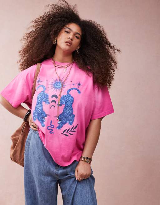 ASOS DESIGN Curve – Różowy T-shirt oversize z grafiką i haftem z motywem astrologicznym