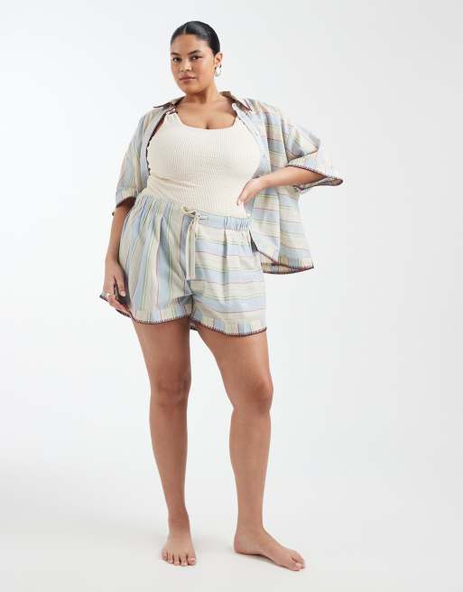 ASOS DESIGN Curve – Sasha – Szorty plażowe z ozdobnymi szwami i wzorem w sprane pasy, część zestawu