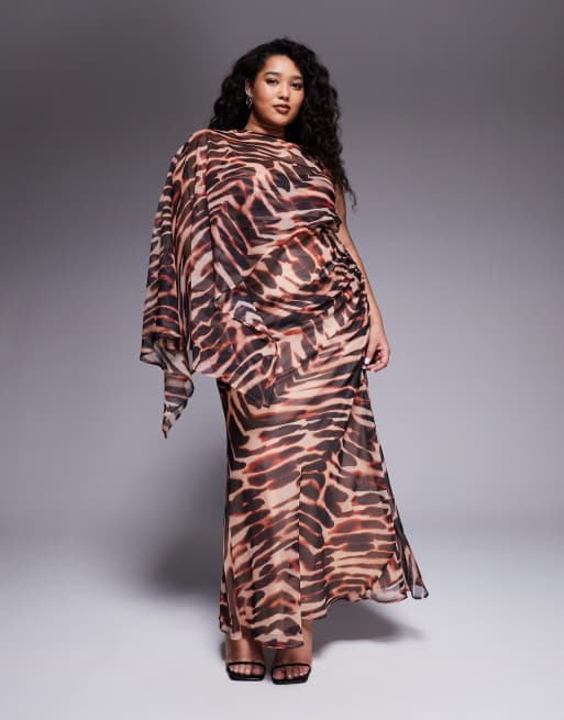 ASOS DESIGN Curve – Sukienka maxi z warstwowymi rękawami i drapowaną spódnicą w zwierzęcy wzór