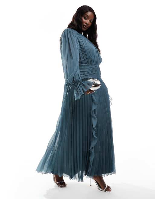 ASOS DESIGN Curve – Szaroniebieska sukienka maxi z marszczeniem w pasie i zabudowanym dekoltem