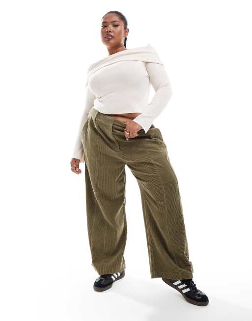 ASOS DESIGN Curve – Sztruksowe spodnie z ozdobnymi szwami i zakładkami w kolorze khaki
