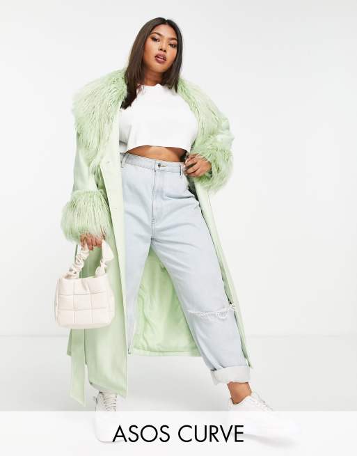 ASOS DESIGN Curve – Wykończony kożuszkiem pistacjowy płaszcz z imitacji skóry z paskiem