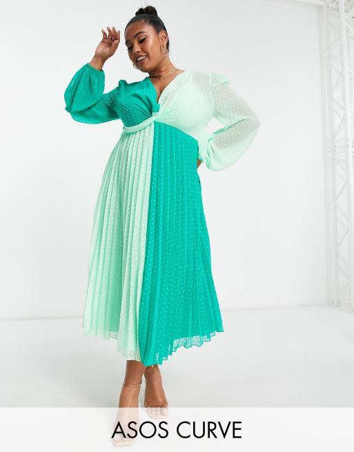 ASOS DESIGN Curve – Zielona plisowana sukienka midi z materiału dobby ze skręconym przodem i blokami kolorów