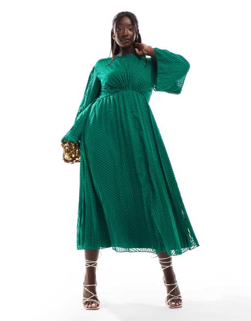 ASOS DESIGN Curve – Zielona plisowana sukienka midi z szyfonu we wzór w jodełkę z wiązaniem na plecach i rozszerzanymi rękawami