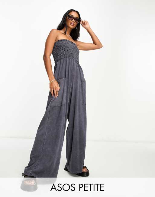 ASOS DESIGN Petite – Czarny marszczony kombinezon dżersejowy z dekoltem bandeau i efektem sprania