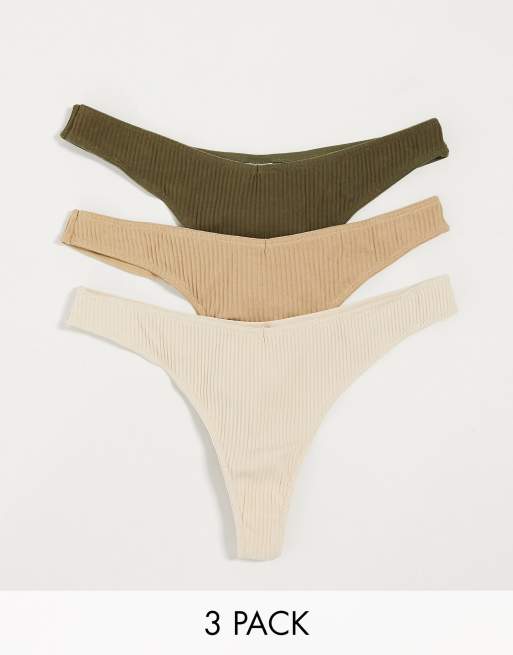 ASOS DESIGN – Zestaw 3 par prążkowanych stringów w kolorach beżu, khaki i brązu