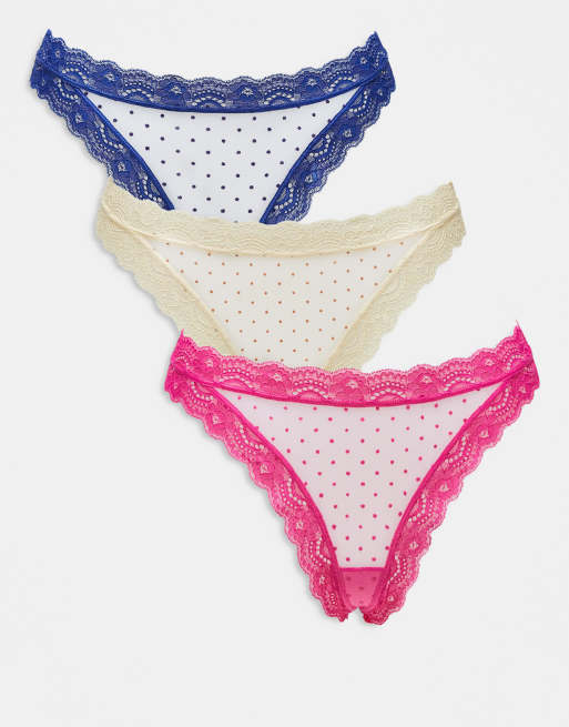 ASOS DESIGN – Zestaw 3 par siateczkowych stringów z flokowanym wzorem w kropki w kolorze różowym, niebieskim i jasnożółtym