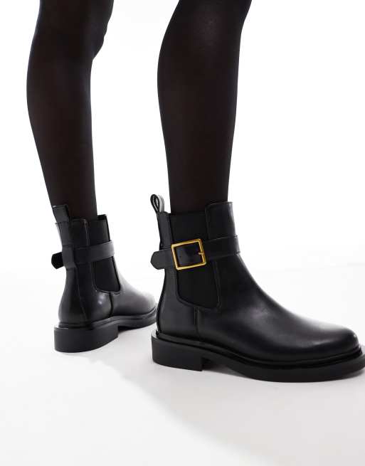 ASOS DESIGN Wide Fit – Aurora – Czarne, płaskie botki z paskiem i sprzączką