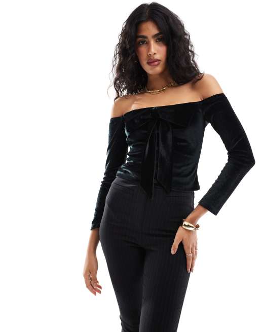 ASOS DESIGN – Aksamitny czarny top z długim rękawem i dekoltem bardot z dużą kokardką
