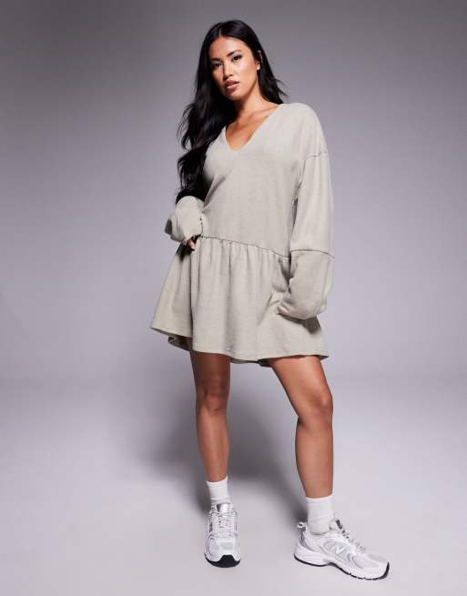 ASOS DESIGN – Bardzo miękka brązowoszara sukienka mini z dekoltem w kształcie litery V i obniżonym stanem