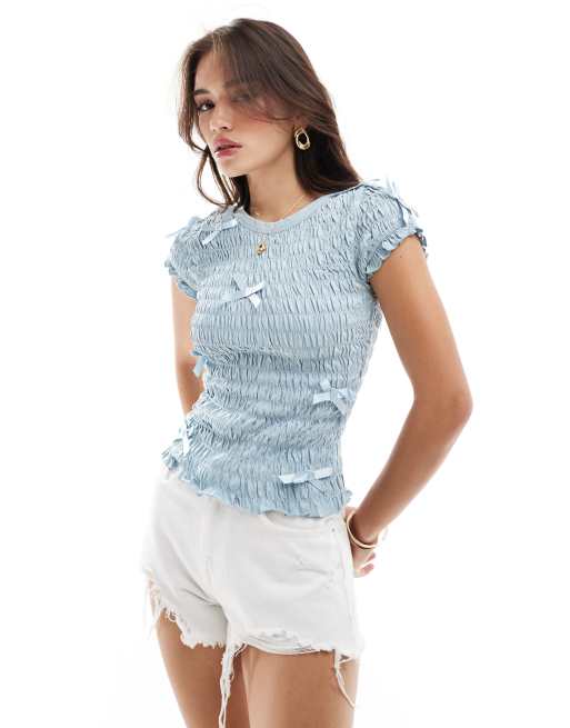 ASOS DESIGN – Błękitny krótki T-shirt z marszczonego materiału z kokardkami