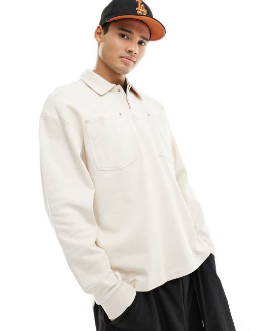 ASOS DESIGN – Beżowa koszulka polo oversize w stylu rugby z ozdobnymi kieszeniami
