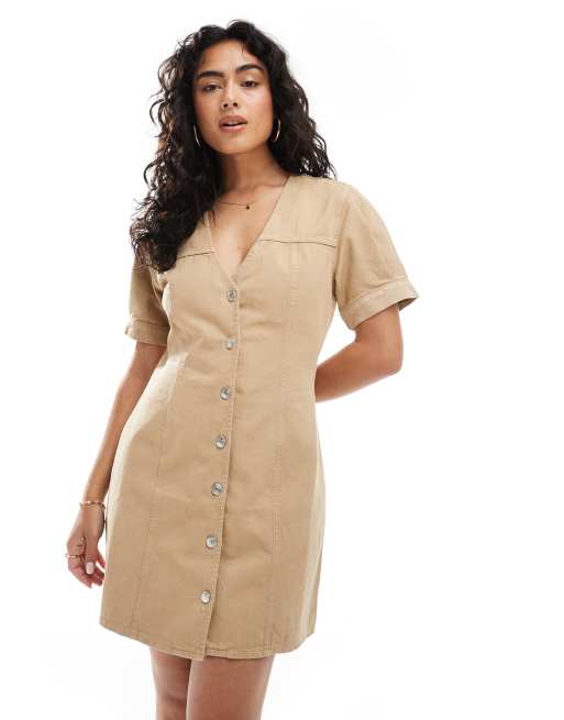 ASOS DESIGN – Beżowa zapinana na guziki jeansowa sukienka mini z bufkami