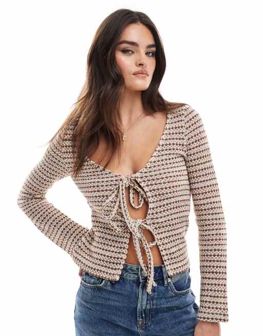 ASOS DESIGN – Beżowo-biały wiązany z przodu top dzianinowy w paski